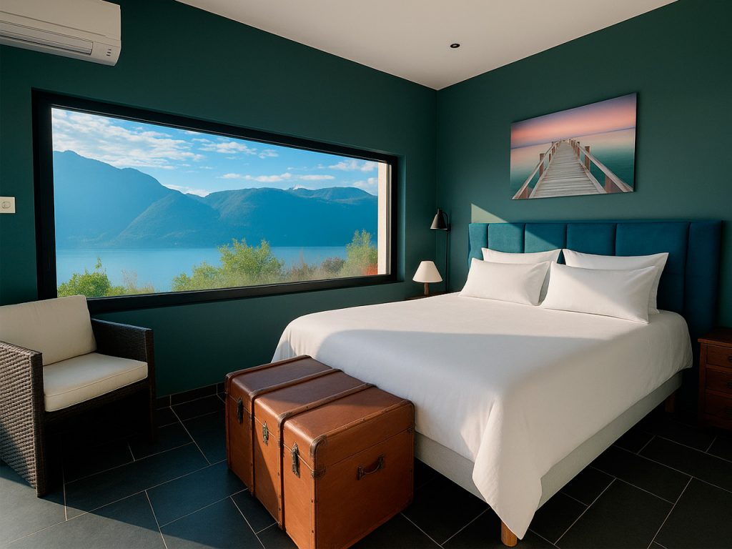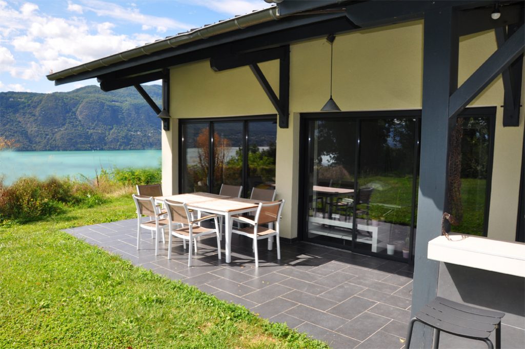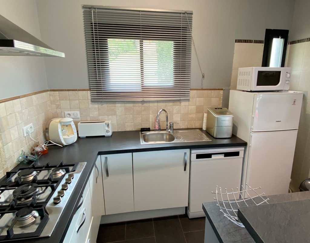 A cela s’ajoute la salle de bains avec douche italienne, une cuisine ouverte sur le salon, un dressing, et les WC. L’ensemble est très lumineux avec 3 grandes baies vitrées coulissantes, laissant une large vue sur le lac et le parc. Important aujourd’hui, le cabanon est climatisé.